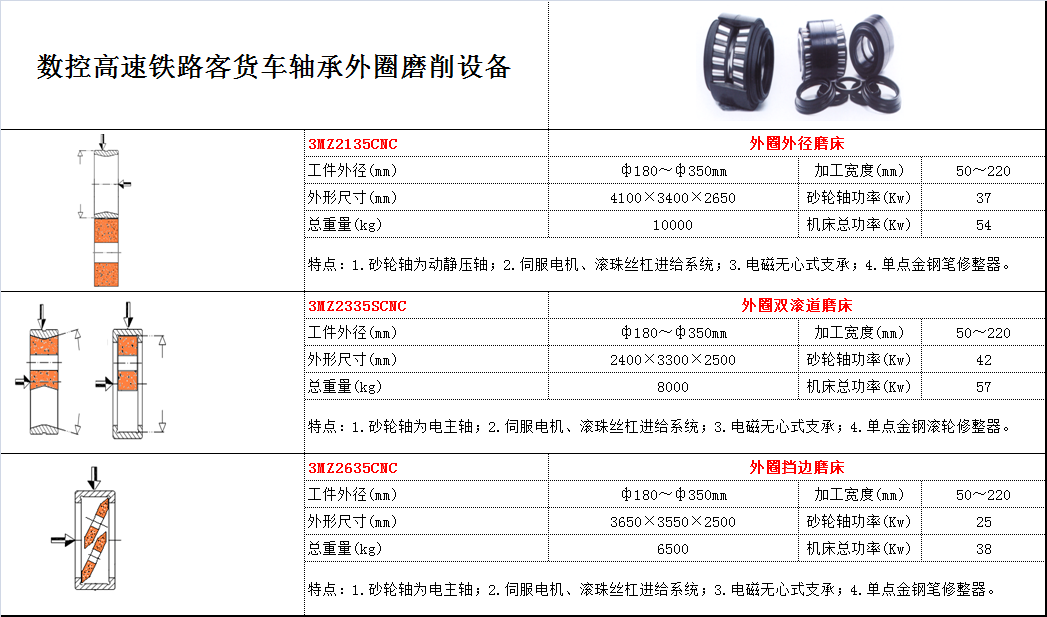 用途:磨削高速鐵路客貨車軸承的外圈 特點: 1.砂輪軸為動靜壓軸; 2.伺服電機、滾珠絲杠進給系統(tǒng); 3.電磁無心式支承; 4.單點金鋼筆凸度修整器。